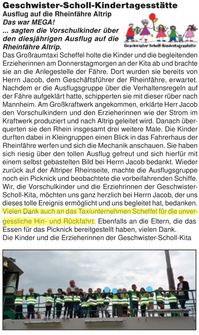 Die Ruftaxilinie wird seit der ersten Fahrt im Jahr 1986 in hervorragender Weise durch die Firma „Taxi Scheffel“ in Altrip bedient.